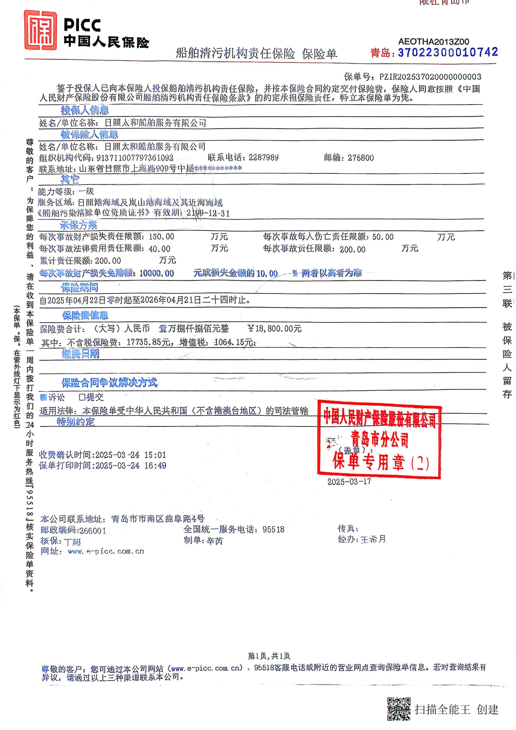 日照太和船舶服务有限公司(以下简称公司)成立于2004年,是太和公司在日照港设立从事船舶残油(泥)、污油水接收和沿海防污清除的一级资质单位,2011年12月份已顺利通过国家交通部及海事部门的专家审核,目前服务区域以连云港为中心,覆盖盐城大丰港、日照港、岚山港及其附近海域。